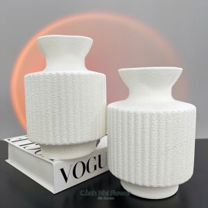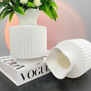 Bình nhựa cổ bèo vân sần – Cao 16,5cm – Đáy 11,6cm – Miệng 7,6cm – Hoa Lụa Cảnh Nhi