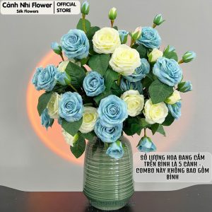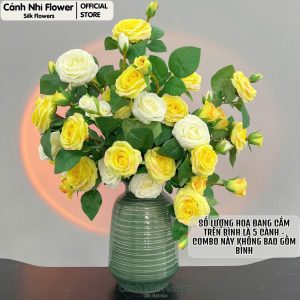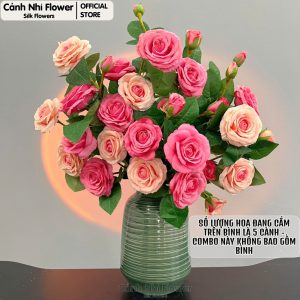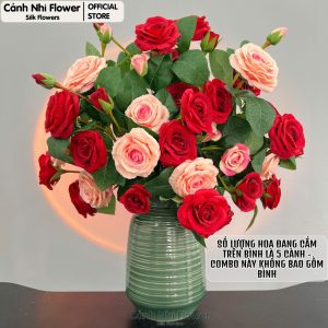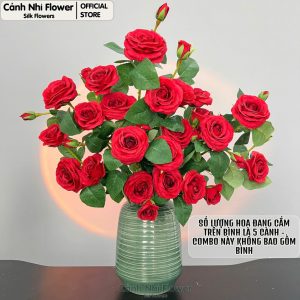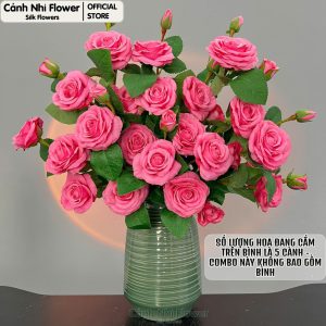 Cành hoa hồng pháp 5 bông 2 nụ – Cao 75cm, Bông To 8cm – Hoa giả thân cao su – Cảnh Nhi Flower