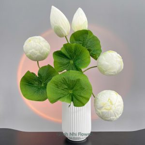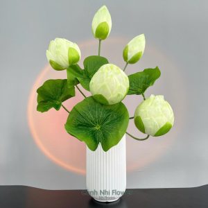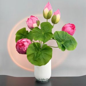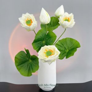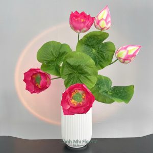 Cụm hoa sen 3 bông, 2 búp, 4 lá – Cao 65cm – Hoa vải, thân nhựa lõi thép – Cảnh Nhi Flower