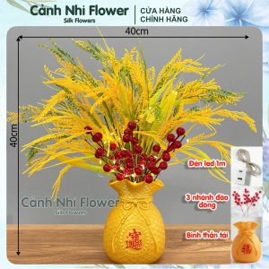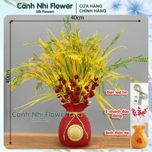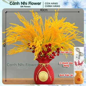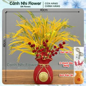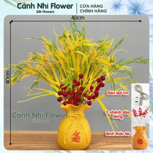 • Chất liệu:Cành lúa: Thân nhựa lõi thép, bông vải lụa bền đẹp, giống thật đến 95%.Bình: Nhựa cao cấp phủ sơn bóng, in hình thần tài nổi bật.