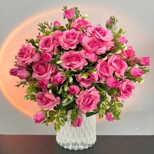 Combo 5 cụm hoa hồng tỉ muội là lựa chọn hoàn hảo để tạo điểm nhấn rực rỡ và sang trọng cho không gian sống. Mỗi cụm gồm 7 bông hoa nở rộ và 7 nụ hoa xinh xắn, mang đến tổng cộng 35 bông và 35 nụ trên toàn bộ combo. Bộ sản phẩm được tặng kèm bình nhựa phong cách hiện đại, giúp bạn dễ dàng bày trí mà không cần tốn thêm chi phí cho phụ kiện.