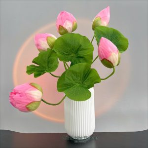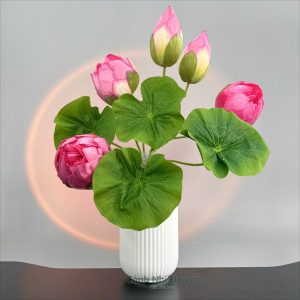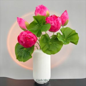 (Tặng Bình Nhựa Như Ảnh) Cụm Hoa Sen Búp 3 Bông, 2 Búp, 4 Lá – Hoa Vải, Thân Nhựa Lõi Thép – Trang Trí Decor